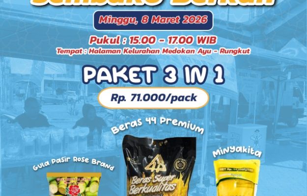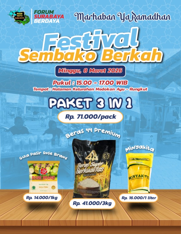 Kegiatan pasar sembako murah tersebut dijadwalkan berlangsung pada Minggu, 8 Maret 2026, mulai pukul 15.00 WIB hingga selesai, di Kelurahan Medokan Ayu, Kecamatan Rungkut, Surabaya.