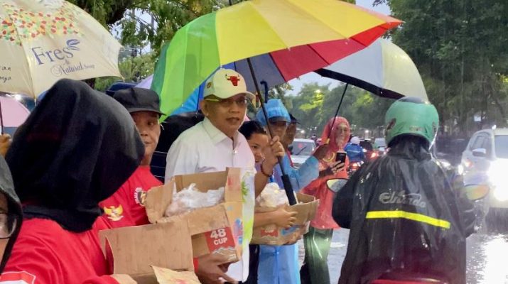Aksi berbagi itu juga dihadiri oleh Anggota DPRD Kota Surabaya Tri Didik Adiono yang turut berdiri di pinggir jalan menyapa para pengendara.