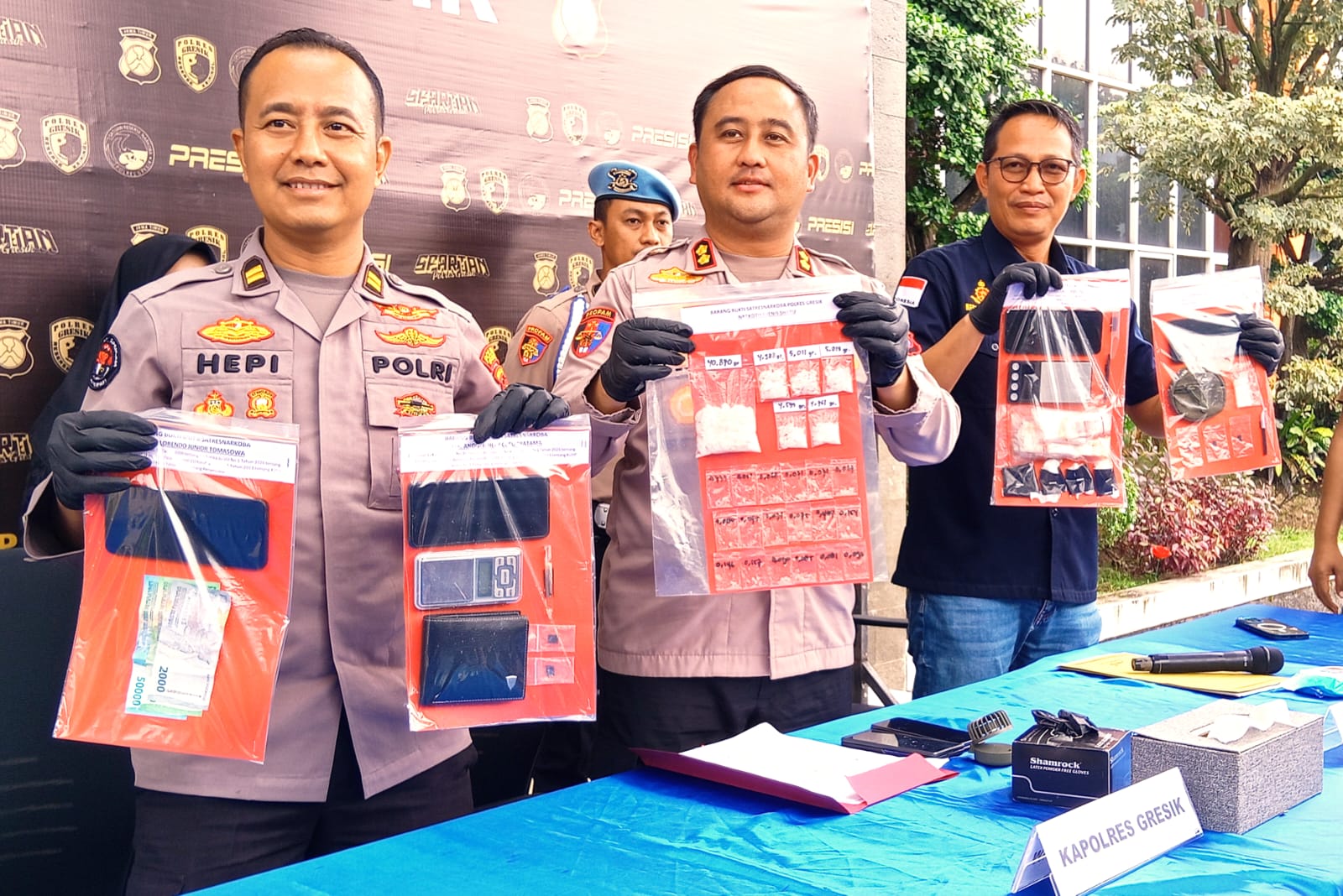 Kapolres Gresik AKBP Ramadhan Nasution mengatakan, seluruh barang bukti yang disita mencapai 68,21 gram sabu yang terbagi dalam 25 paket.